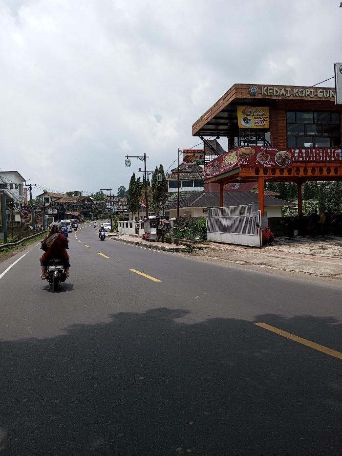 The image captures a daytime street scene in the city of Chendenbji, Bhutan, under an overcast sky. A two-lane asphalt road, marked with yellow dashed center lines, extends into the distance. In the foreground on the left lane, a motorcycle is being operated by an individual wearing a red top and a light-colored head covering, with a second person riding as a passenger, both moving away from the viewer. Further down the road in the same lane, a second motorcycle is visible. On the right side of the road, a paved sidewalk fronts a prominent two-story commercial building featuring a brown-tiled roof and large windows. A sign on its upper facade reads "KEDAI KOPI GUNUNG." Below this, an open-air area is covered by a red banner displaying "GULAI KAMBING" and images of food. Adjacent to this structure, a white metal gate encloses a smaller building, with a person dressed in red seated near the gate. Decorative streetlights are spaced along the right sidewalk, and a small vendor cart is also present. Various other buildings, interspersed with green foliage, line both sides of the street, with additional vehicles visible in the background.