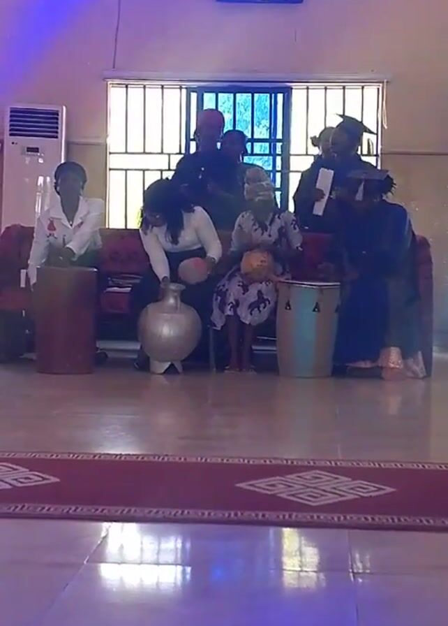 A group of seven people, mostly women, are gathered in a room playing music with various percussion instruments. They are positioned in front of a window, sitting on a dark-colored sofa. A woman in a white top is playing a large, rounded, silver-colored pot-like instrument with a red object, while others are playing drums and percussion instruments. One of the people, presumably a woman, on the right is wearing graduation attire. There is a red patterned rug on the floor in front of the group. A sign above them reads "SONG MINISTRATION WOMEN FELLOWSHIP". There is an air conditioner visible to the left. The room appears to be well-lit.