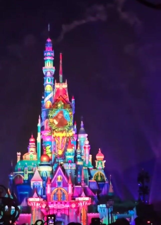 colorful castle illuminated at night, likely part of a light show. The castle is elaborately designed with multiple towers, domes, and decorative elements. It is bathed in bright, changing colors, including pink, blue, green, red, and yellow. There appear to be light projections on the castle as well. In the foreground, silhouettes of people can be seen, many holding up their phones to record the event. The background is a dark night sky. The overall atmosphere is festive and magical.