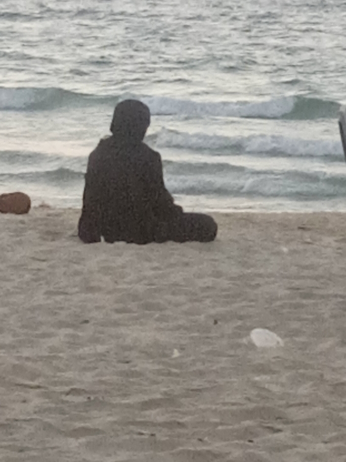 - "An individual clad in a dark, full-body garment, including a head covering, is seated facing the sea on a sandy beach in Al-Mawasi, Palestinian Territories" by FM-cV3b62, licensed under CC BY 4.0
