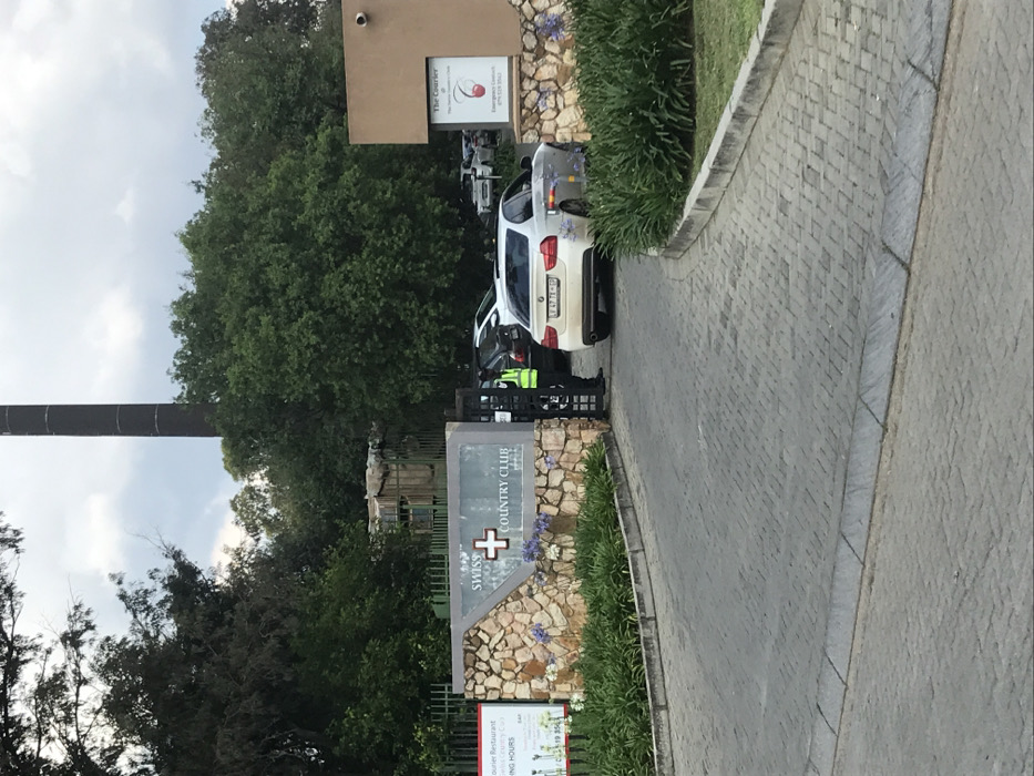 The image displays the entrance to the Swiss Country Club in Randburg, South Africa, under an overcast sky