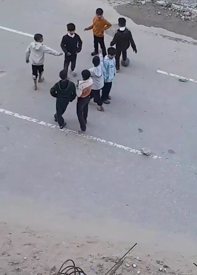 A high-angle shot shows a group of around eight children playing with a soccer ball in the middle of a street