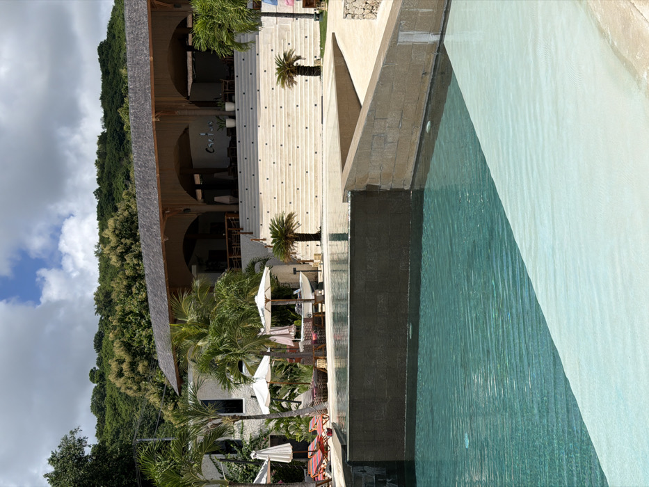 A multi-tiered building stands beside a swimming pool. The building, constructed with light-colored materials, features arched openings and a brown roof. A long staircase connects different levels. Tropical vegetation surrounds the building, contrasting with its modern design. The swimming pool's water reflects light, creating a shimmering effect, and its edge appears to blend with the building's base. The sky, marked with clouds, provides a natural backdrop.