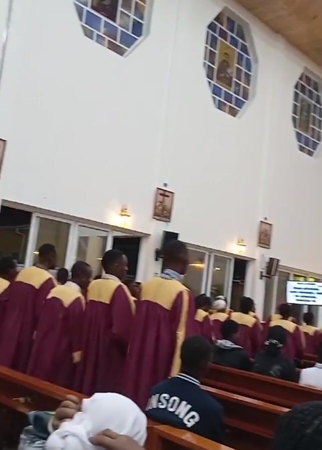 inside of a church, presumably during a service or event. There is a choir of individuals dressed in maroon and gold robes facing away from the camera. They are standing in the front row of the church. Behind the choir, people are seated in wooden pews. Several architectural details are visible, including windows with stained glass in geometric patterns, wooden beams on the ceiling, wall sconces, and religious pictures on the walls. A screen in the front of the church displays text. The perspective is from someone sitting in the pews, showing the backs of heads and shoulders of the people in front.