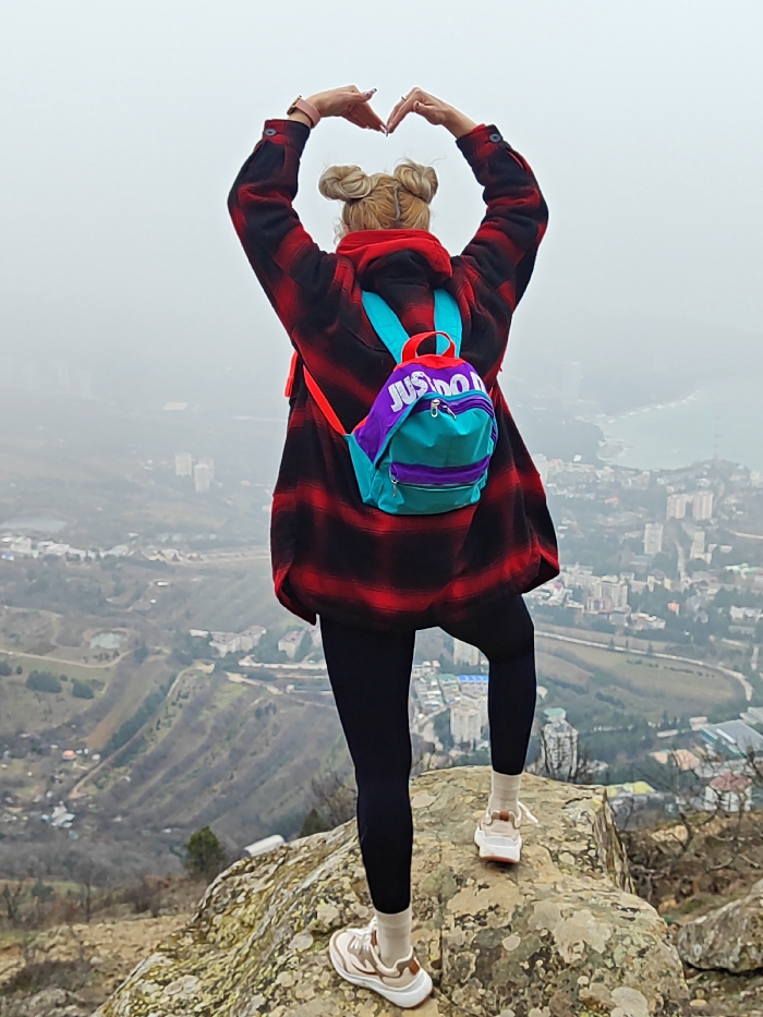 An individual, viewed from behind, stands atop a large, mossy rock formation, overlooking the city of Partenit, Ukraine. The person is dressed in an oversized red and black plaid jacket, black leggings, beige socks, and light-colored athletic shoes. A small, multi-colored backpack, primarily teal with purple, red, and orange elements and the text "JUST DO IT," is worn. The individual's light-colored hair is styled into two distinct buns. Both hands are raised above the head, with thumbs and index fingers touching to form a heart shape; a pink smartwatch is visible on the left wrist. The background reveals a vast urban landscape of Partenit with numerous buildings nestled among rolling hills and valleys, extending towards a body of water (likely the Black Sea) under a hazy, overcast sky. The distant coastline is visible, outlining the urban sprawl against the muted sky.