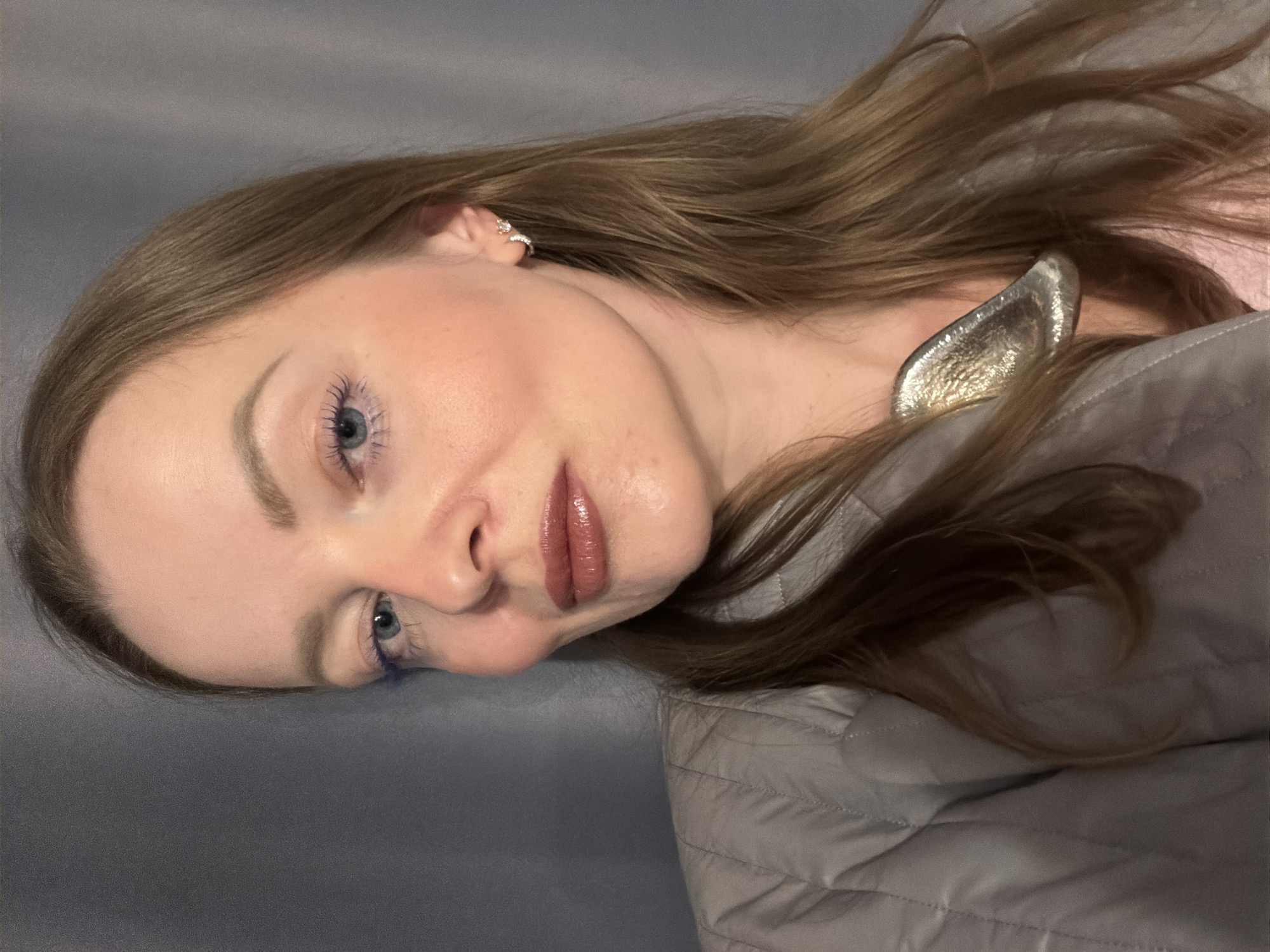A woman with blonde hair and fair skin is lying on a gray quilted surface. She has blue eyes with blue mascara. She is wearing a small earring in her left ear. A silver or gold object that resembles an ear is visible near her neck. Her lips are coated with a glossy, brownish-red lipstick. The location is not identifiable as Moscow, Russia.