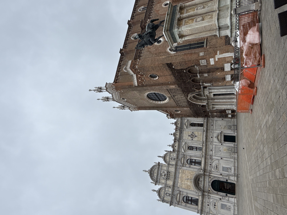 The image depicts the Campo Santi Giovanni e Paolo in Venice, Italy. The scene is dominated by two historical buildings: on the right, the large, brick-colored Basilica di Santi Giovanni e Paolo, characterized by Gothic architecture with a prominent rose window, arched entrances, and spires; on the left, the lighter-colored, ornate Renaissance façade of the Scuola Grande di San Marco, featuring multiple windows, decorative carvings, and classical elements. In front of the Basilica, to the right, stands the dark equestrian statue of Bartolomeo Colleoni atop a multi-tiered stone pedestal. The ground is a paved public square composed of light grey interlocking pavers. In the mid-ground, to the right, orange temporary construction fencing encloses an area containing several large, white plastic-wrapped bags, likely containing building materials or debris. A dark chair or furniture piece is partially visible in the extreme bottom right corner. A single small, dark bird is visible on the paving stones near the center-left. The sky above is uniformly overcast and grey, indicating a cloudy day with diffuse lighting. No individuals are present in the scene.