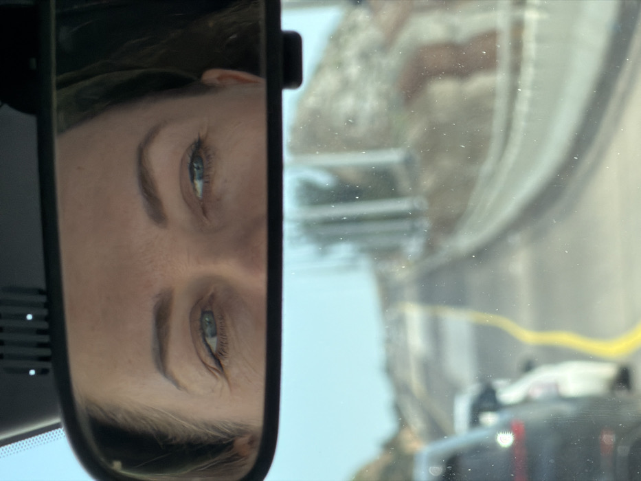 The image depicts a scene from inside a vehicle traveling on a road in Safed, Israel, during daytime. The upper portion of the frame shows the reflection of a person's eyes and forehead in the vehicle's rearview mirror. The individual has light-colored eyes with visible eyelashes and eyebrows, and fine lines are present around the outer corners of the eyes. The lower portion of the image, viewed through a dust-speckled windshield, shows a two-lane asphalt road with a solid yellow center line, ascending into the distance. Multiple vehicles, including a dark SUV and a lighter-colored car, are visible ahead in the left lane, out of focus. The surrounding environment consists of dry, hilly terrain with sparse vegetation. A light-colored guardrail follows the curve of the road on the right side, and utility poles are visible alongside the road. The sky is clear and light blue.