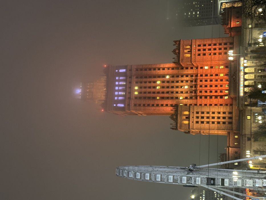 - "An urban landscape at night features the Palace of Culture and Science, illuminated with warm orange and yellow lights, partially obscured by fog" by FM-Qm3Z63, licensed under CC BY 4.0