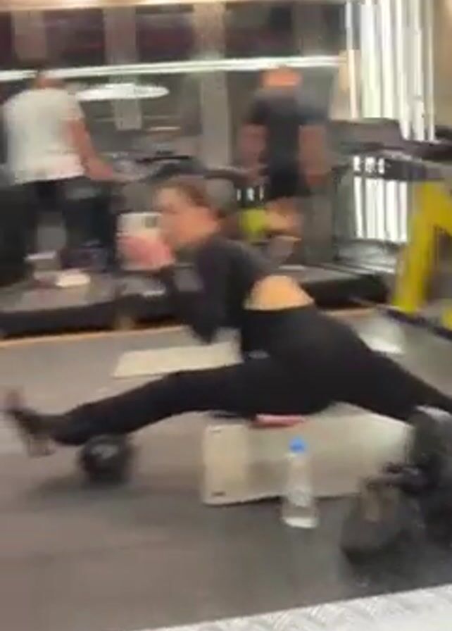 young woman in a gym doing a split on a bench. She wears a black, long-sleeved workout outfit and black socks. She holds a phone in her right hand, presumably taking a photo or video of herself. Her left foot rests on a foam roller, while her right foot rests on another roller. A water bottle sits near her right leg. In the background, men walk on treadmills, and gym equipment is visible. The scene is brightly lit by overhead lights. The camera is positioned in front of a mirror, reflecting the woman and the gym environment.