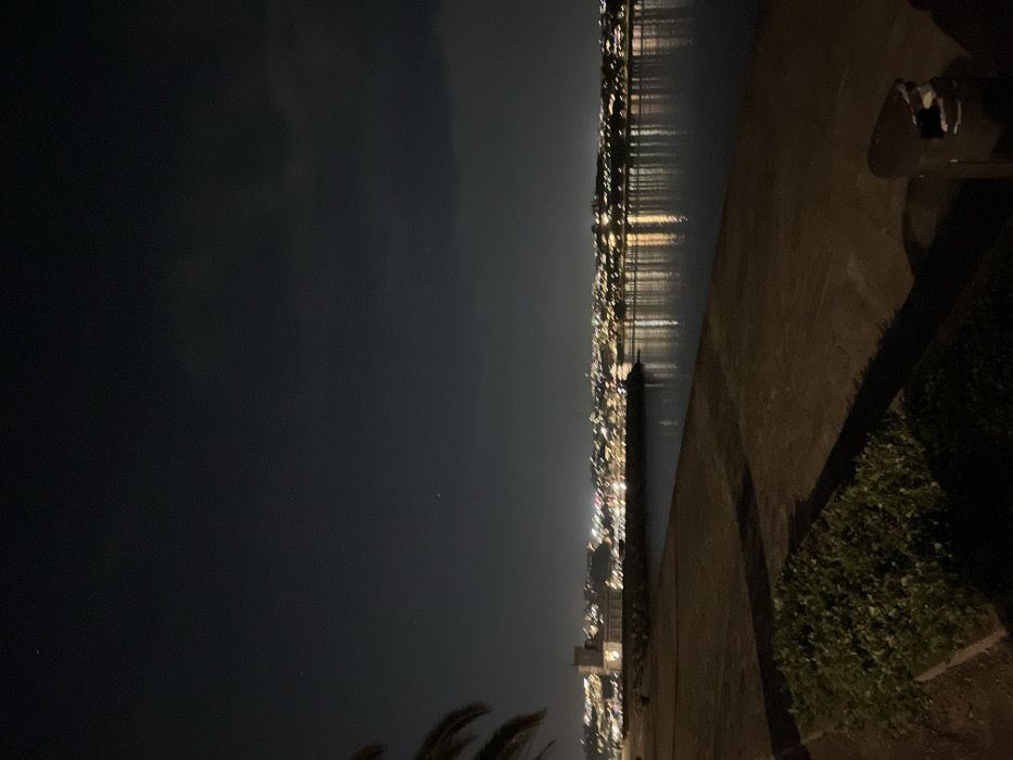 A nighttime cityscape is reflected in dark water. Lights line the opposite shore, creating streaks on the water's surface. A dark sky above contrasts with the illuminated city. A rough, dark walkway runs along the right side of the image, with foliage and a lamp visible.