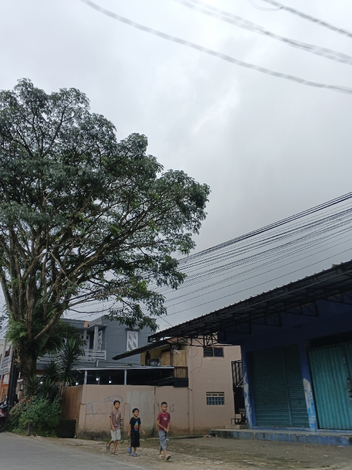 The image displays an outdoor street scene in Drangpa Pangsar, Bhutan, under an overcast grey sky. Three pre-adolescent males are walking from left to right on a dirt shoulder bordering an asphalt road. The leftmost individual wears a light-colored t-shirt and shorts, the central individual wears a dark t-shirt and dark shorts, and the rightmost individual wears a red t-shirt and light-colored shorts. On the left side of the frame, a large tree with a thick trunk and dense green foliage stands prominently, partially obscuring a multi-story grey residential building with white balconies and window frames behind a low concrete wall. To the right, a commercial-style building with a blue facade features two closed, vertical teal corrugated metal roll-down doors and a dark metal awning extending over the sidewalk area. Behind the walking individuals, a two-story beige building is visible behind the concrete wall. Multiple parallel black utility lines traverse the upper middle and right sections of the image against the sky.