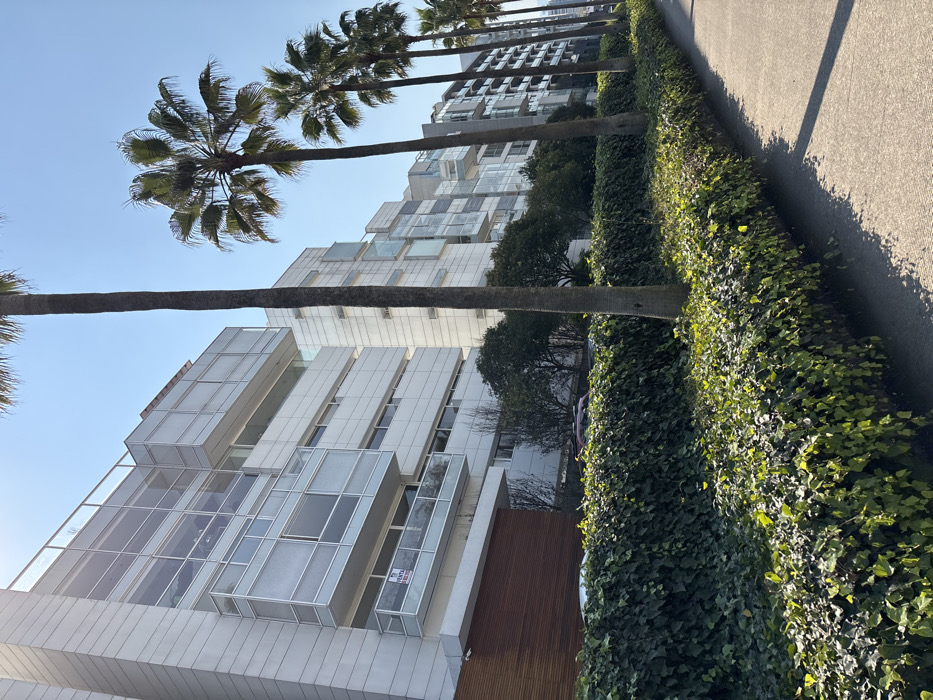 The image depicts a sunlit street in a modern residential area of Mexico City, Mexico. The environment features a clear blue sky and bright sunlight, casting distinct shadows on the ground. In the foreground, a wide concrete sidewalk extends along the right edge of the frame. To its left, a low, dense hedge of dark green ivy-like foliage lines the path. Behind this, a strip of varied green shrubs and bushes, some with lighter leaves, forms a natural buffer. A row of tall palm trees with slender, dark brown trunks stands vertically along this green strip, extending upwards out of the frame. Their green fronds are visible against the bright sky. Along the left side of the street, a continuous series of multi-story modern residential buildings dominates the background. These structures exhibit light-colored, possibly white or light grey, horizontal paneling on their facades, large rectangular windows, and balconies with glass railings. On a lower-level balcony of the leftmost building, a white sign with red text, reading "VENTA" (FOR SALE), is visible. The ground floor of this primary building features a facade constructed from horizontal wooden slats. Further down the street, subsequent buildings maintain a consistent contemporary architectural style, characterized by light-colored exteriors and prominent glass elements. No people are present in the scene. A light-colored vehicle is partially visible behind the foreground greenery in front of the buildings.