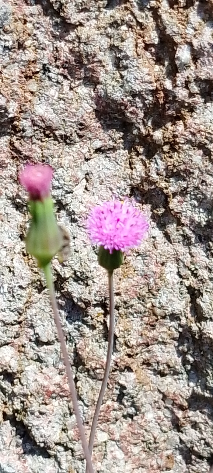 The image presents a close-up, vertical forensic view of two small, flowering plants set against a textured rock surface in Bogor, Indonesia. A fully bloomed, spherical flower, approximately 1-2 cm in diameter with vibrant pink-magenta florets, is positioned on the right, supported by a slender, greenish-brown stem. To its left and slightly behind, a second plant displays a closed flower bud, characterized by a deep pink-magenta tip and prominent green sepals, also on a thin, greenish-brown stem. The background consists of an uneven, granular, and porous rock surface, displaying shades of grey, brown, and reddish-brown, indicative of weathered natural stone or rough concrete. The lighting suggests direct sunlight, highlighting the textures and casting faint shadows. No other subjects or actions are discernible.