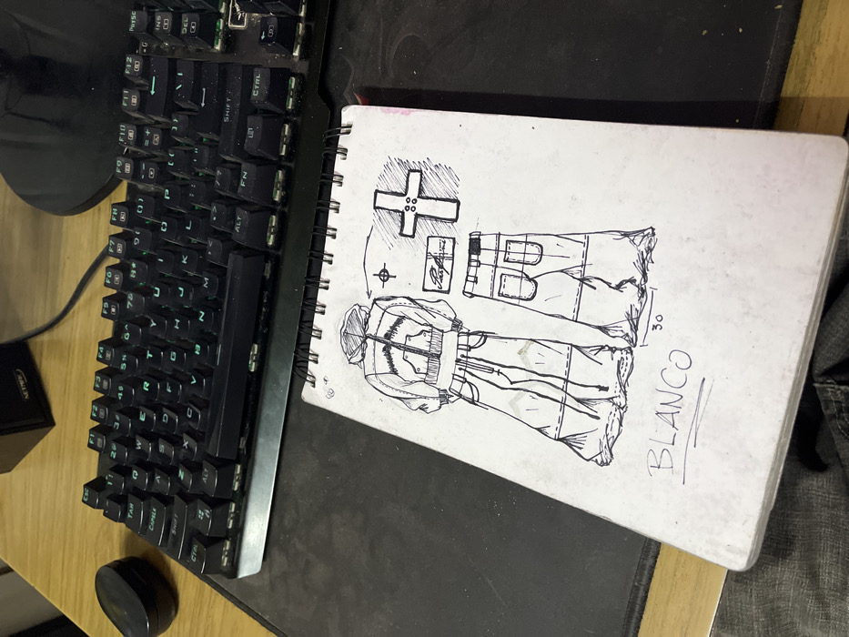 A spiral-bound notebook displaying hand-drawn fashion designs is situated on a black mouse pad, which rests on a wooden desk surface. The notebook contains sketches of a hooded jacket with ribbed cuffs and hem, featuring a chevron pattern on the back, and loose-fitting wide-leg pants with detailed pockets. Adjacent to these garments are additional sketches: a rectangular label with the text "Passione," a target symbol, and a cross symbol marked with four circles. The word "BLANCO" is handwritten and underlined at the bottom of the page, followed by the number "30." A black mechanical keyboard with illuminated green keys, exhibiting dust accumulation, occupies the background behind the notebook. To the left of the keyboard is a small, black, oval-shaped container. Further in the background, a black electronic device branded "Nither" and a dark circular base are visible. A dark fabric material is partially visible in the lower left corner of the frame. This scene is located in Bahía Blanca, Argentina.