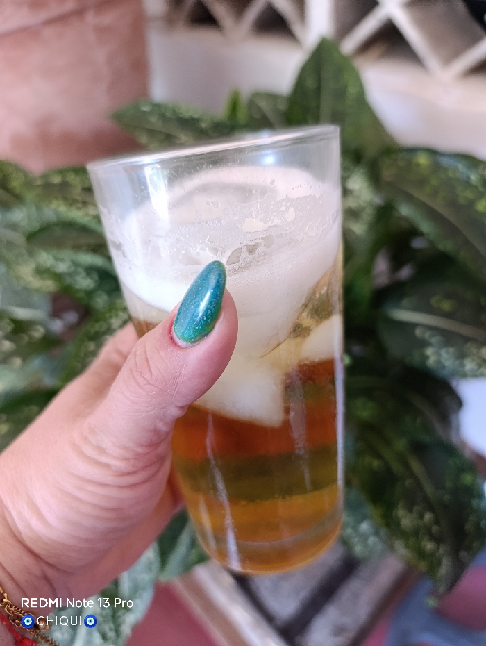 A close-up, vertical photograph captures a human hand holding a clear, cylindrical glass against a blurred background in the city of Macho Muerto, Venezuela. The hand, visible from the wrist, has visible skin creases, and the prominent thumb features a shimmering teal-green polished fingernail. A red-beaded bracelet with a blue 'evil eye' charm is partially visible on the wrist in the lower-left quadrant. The transparent glass contains a beverage composed of multiple layers. The top section features a white, frothy foam adhering to the glass interior. Beneath the foam are several irregular ice cubes. Below the ice, the liquid is distinctly stratified into at least three visible layers: a reddish-brown upper layer, a central greenish-yellow layer, and a bottom golden-amber layer. The background is out of focus, presenting verdant green foliage with lighter markings, indicative of an indoor or patio plant. A light brown or terracotta-colored pot is partially visible in the upper-left, and a white, possibly tiled or patterned architectural element is present in the upper-right. The scene is illuminated by ambient light. A digital watermark displaying "REDMI Note 13 Pro" and "👁️ CHIQUI 👁️" is present in the lower-left corner of the image.