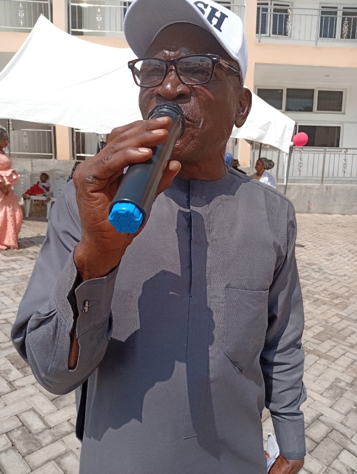 An older man wearing a gray shirt and white baseball cap speaks into a microphone. He has glasses and the microphone is held close to his mouth. A white tent is visible in the background, along with a building and other people. A pink balloon is also seen. The scene appears to be an outdoor event.