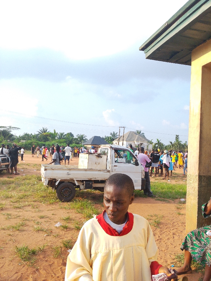 A young person in a white robe with red trim stands in the foreground. Behind them, a white pickup truck sits on a grassy field surrounded by a crowd of people. Some individuals are wearing colorful clothing. In the distance, houses and trees dot the landscape under a cloudy sky. A portion of a building with a green roof is visible on the right side of the frame.