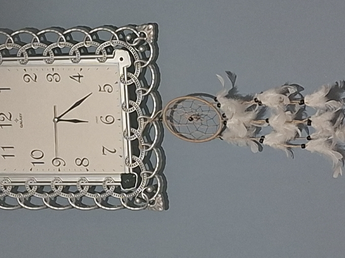 A rectangular wall clock with a silver-colored, ornate frame is mounted on a plain light blue wall. The clock face is light-colored with black Arabic numerals (1-12) and displays the brand "GALAXY." The clock hands indicate approximately 6:25. Directly below the clock, a dream catcher hangs, featuring a circular, light-colored hoop with an internal web-like netting. Multiple strands adorned with white feathers and small dark beads descend from the bottom of the hoop. The scene is located in the city of Selyanin, Bulgaria.