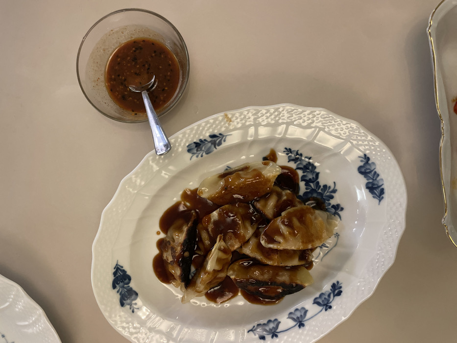 An overhead view depicts a dining setting on a light beige tabletop in Copenhagen, Denmark. The primary subject is an oval white porcelain plate, consistent with Royal Copenhagen's "Blue Fluted" pattern, containing approximately eight to ten pan-fried dumplings. These dumplings are covered in a dark, glossy brown sauce; one dumpling is partially open, revealing a dark filling. Adjacent to this plate, on the upper right, is a small, clear glass bowl holding a reddish-brown dipping sauce flecked with black sesame seeds and other particulates. A small silver-colored spoon rests within this dipping sauce. Partially visible in the upper left corner is a portion of another white Royal Copenhagen "White Fluted" plate. A small section of a third, white and gold-rimmed dish with an orange-red item is visible at the bottom-right edge of the frame. No individuals are present.