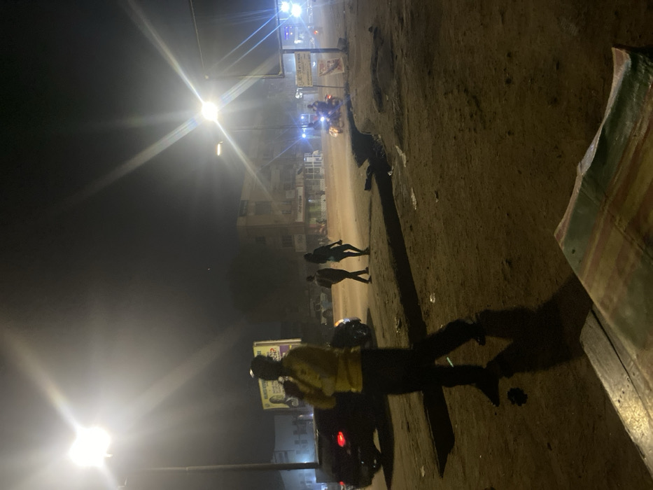 A nighttime urban scene presents a dimly lit street with scattered people. Streetlights glare, casting long shadows. A man in a yellow shirt stands near a parked car with its rear lights visible. Further up the street, more people walk, and motorcycles are parked. Buildings line the background, their details obscured by the darkness and glare from the lights. The image's perspective is slightly tilted.