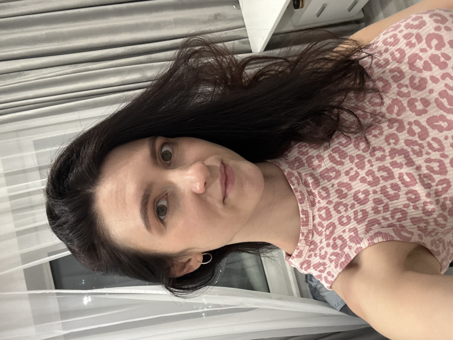 A light-skinned woman with dark brown hair takes a selfie indoors. She wears a pink leopard-print top and small silver hoop earrings. The background includes a white bedside table, a curtain, and a window showing an indistinct view of what appears to be outside, potentially illuminated by a street lamp or daylight. The overall impression is casual and relaxed.