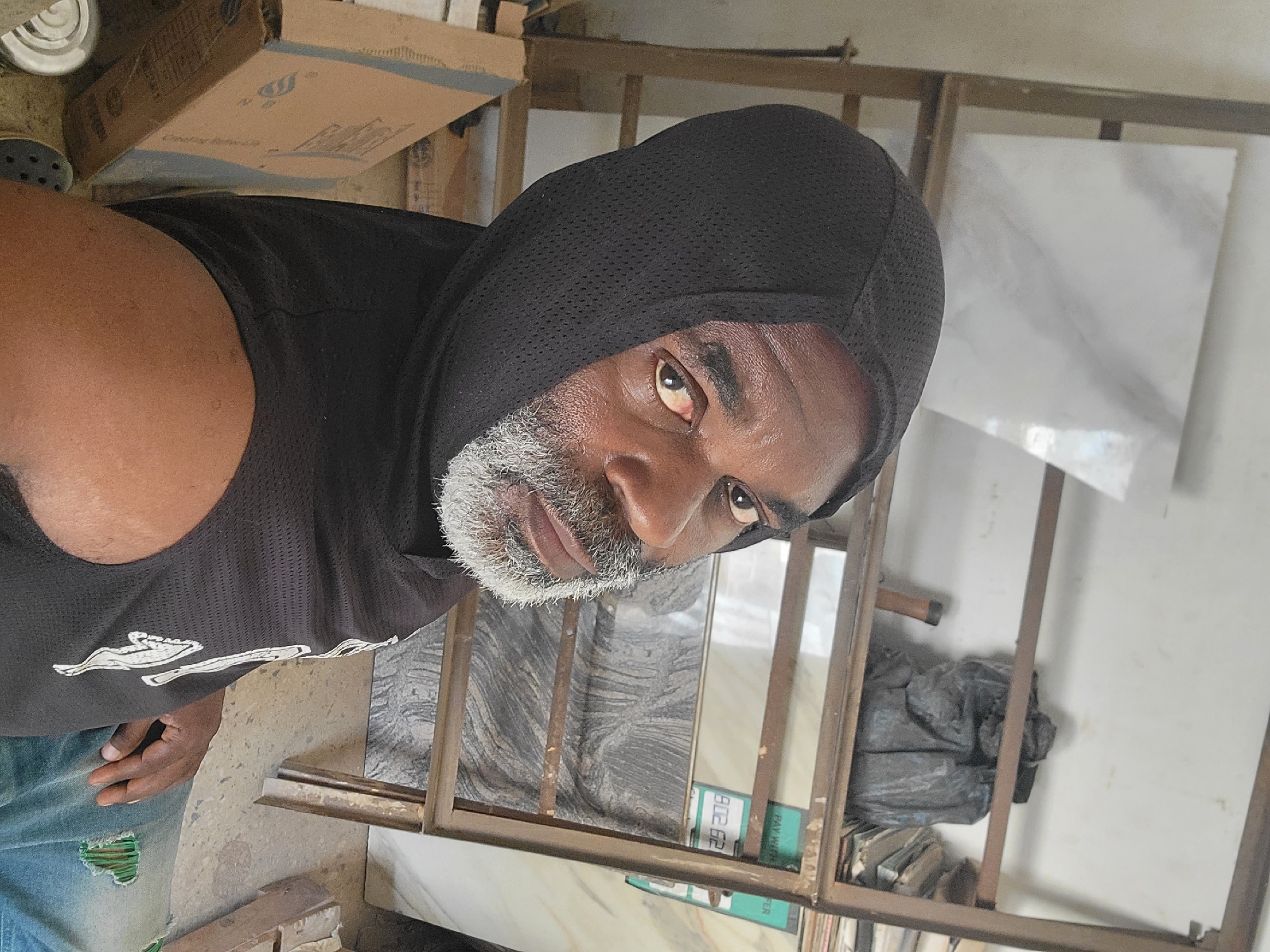 A close-up, high-angle portrait depicts a man with a graying beard and a black, hooded athletic shirt. He is looking directly at the camera with a serious expression. The background reveals an indoor setting with boxes, metal racks, and marble tiles. No specific elements definitively indicate the location in the city of Maiburiji, Nigeria.