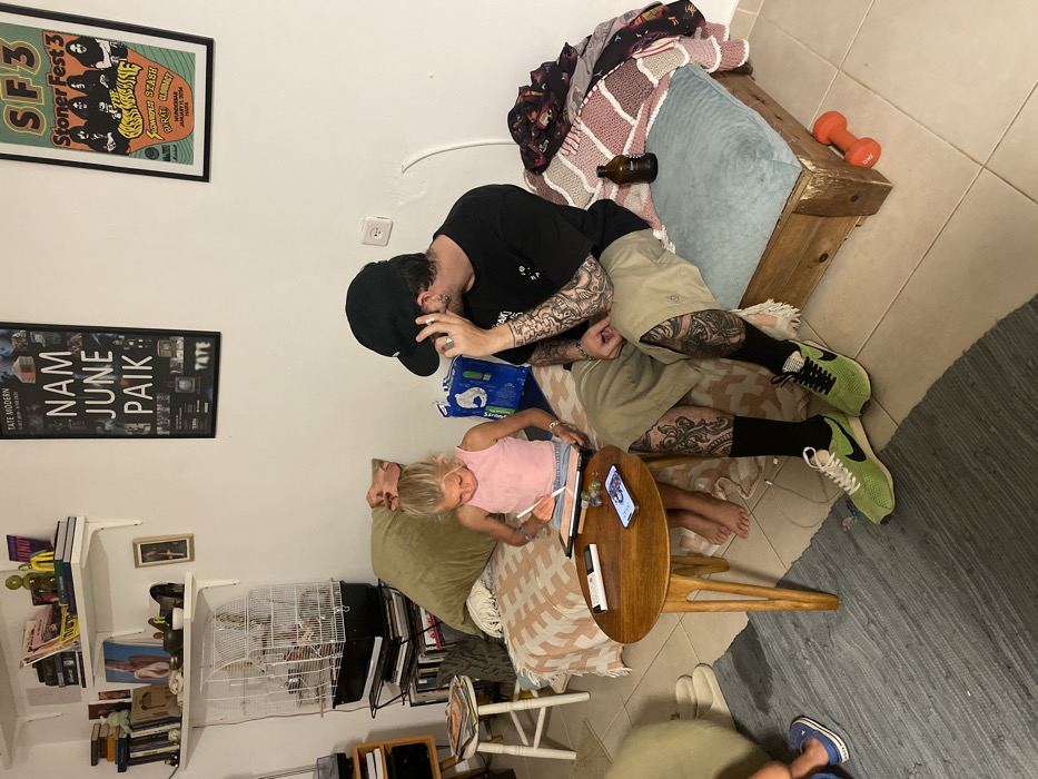 The scene depicts an interior living space in the city of Pardes Hana-Karkur, Israel, characterized by white walls and light-colored floor tiles. In the center foreground, a young blonde girl, wearing a pink tank top and light-colored shorts, is seated barefoot on a daybed. She is actively using a stylus on an electronic tablet that rests on a small round wooden table positioned in front of her. On this table are also a white rectangular object, several colorful small spheres, and a smartphone displaying an image. To the right of the girl, an adult male is seated on a wooden bench with a light blue cushion. He wears a black baseball cap, a black t-shirt, tan shorts, black socks, and bright green Nike running shoes. He possesses extensive tattoos on both forearms and shins. His right hand is near his ear as he looks towards the left. A dark brown bottle is placed on the cushion beside him, and a blue plastic bag is on the daybed near his left. A small orange dumbbell rests on the floor beneath the bench. Behind the young girl, on the daybed, an individual is partially visible, reclining with a large olive-green cushion and a patterned blanket. A cat is resting on the daybed to the left of the olive-green cushion. On the far left of the foreground, the lower legs and feet, clad in blue shoes, of another person are visible. The background features white walls adorned with framed artwork. On the upper center wall, a black-framed poster for "NAM JUNE PAIK" from "TATE MODERN" is displayed. To its right, a green-framed poster advertises "SF3 Stoner Fest 3" with listed bands and locations. On the left wall, two white shelves hold various books, decorative items, and framed pictures. Below these shelves, a large white bird cage stands on a metal rack, with stacks of items beneath it. A white electrical outlet is visible on the right wall. A grey woven rug covers a portion of the floor in the left foreground.
