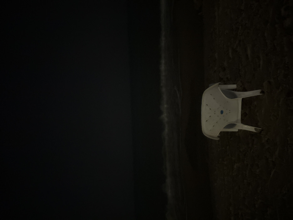 A white plastic chair sits on a dark, uneven surface, possibly sand or soil. To the left of the chair, there's a body of water that extends into complete darkness. The scene appears to be at night or in very low light conditions, with minimal detail visible beyond the chair and immediate surroundings. The chair's placement suggests a beach or waterfront setting.