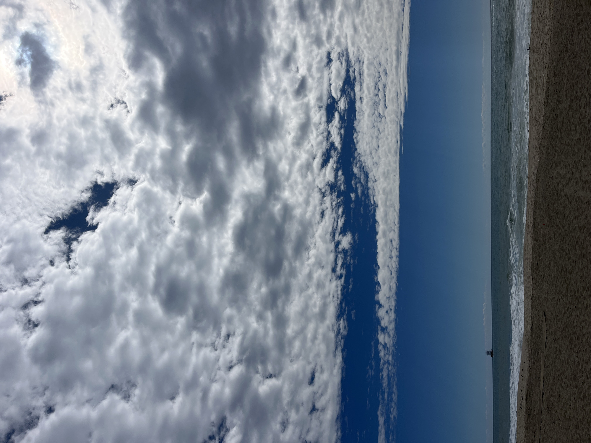 beach scene in Alanya, Turkey, captured on a sunny day with partly cloudy skies. The horizon is visible with a clear line separating the blue sea from the sandy beach. The waves are visible in the ocean with a visible shore line. The cloud coverage varies from heavy on the left side of the image to minimal on the right with the bright blue sky showing through. A small structure or boat is visible in the ocean in the distance.