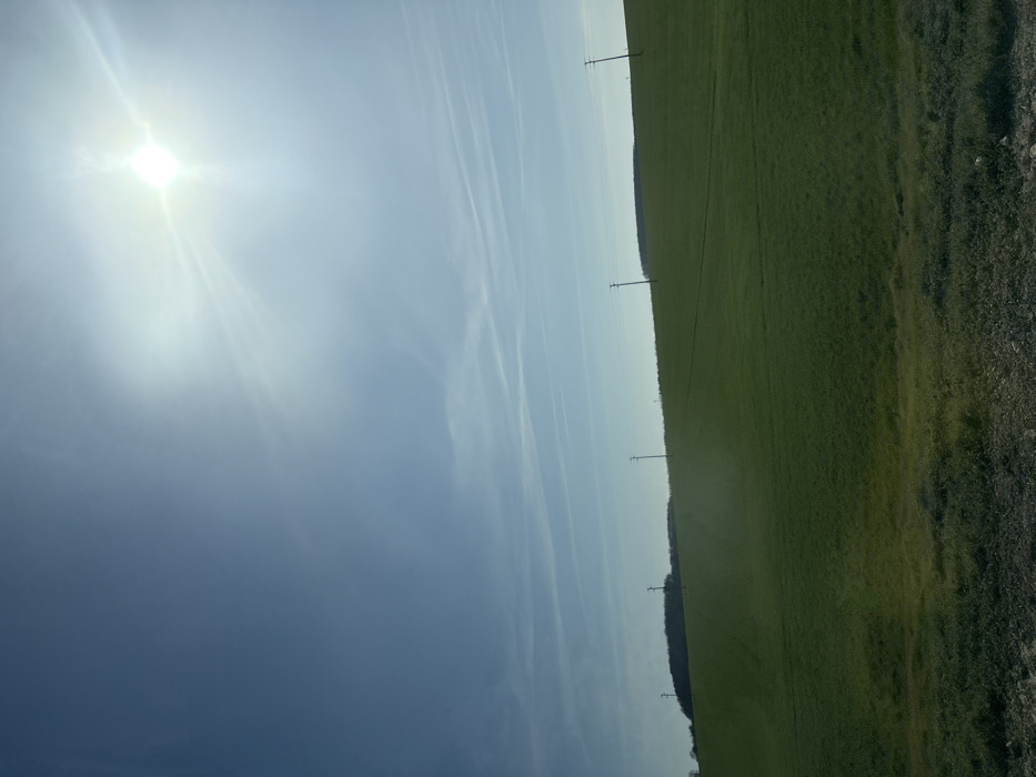 This image depicts an expansive rural landscape, identified as being near Sokolovo, Bulgaria, under a bright, clear daytime sky. The upper third of the frame is dominated by a light blue sky, featuring several faint, wispy, horizontal cloud formations. The sun, an intense point source with prominent lens flare, is situated in the upper right quadrant. The lower two-thirds of the scene consists of a large, gently sloping green field, indicative of agricultural cultivation with young crops. Across this field, traversing the rising terrain, are at least four dark, slender utility poles, casting long, diagonal shadows towards the lower left. A distant line of dark green trees is visible on the horizon line to the far left. The immediate foreground shows a narrow strip of darker, uncultivated ground. No individuals, animals, or discernible activities are present within the frame.