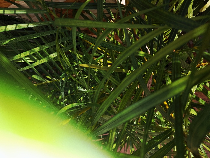A dense array of thin, elongated, green leaves fills the frame, creating an intricate, layered pattern. Sunlight streaks through the leaves, casting shadows and illuminating various sections. The backdrop, barely visible, appears to be a mix of brown and reddish hues. The overall effect is a close-up, organic composition.