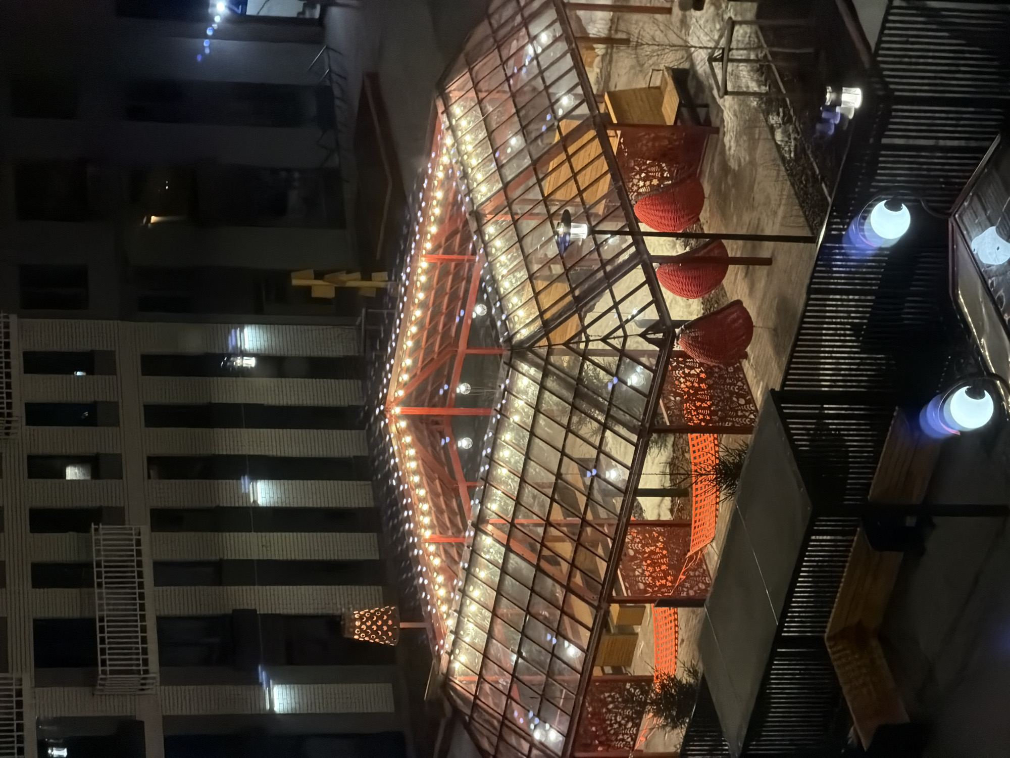 This nighttime aerial photograph depicts an illuminated outdoor communal space within a residential area in Tyumen, Russia. The central feature is a large, square-shaped pavilion with a sloped, transparent roof supported by a dark frame. Strings of warm-toned fairy lights delineate the roof perimeter and extend across the interior, complemented by several globe-shaped pendant lights suspended inside. The pavilion interior contains benches, small evergreen trees, and decorative orange-red perforated panels that function as partitions or backrests. Outside the structure, several red, woven pod-like chairs hang, and orange mesh elements are visible on the snow-covered ground. The surrounding environment includes modern, multi-story residential buildings with light-colored brick or panel facades, featuring dark windows. Patches of snow cover the ground. A tall, lantern-like light fixture with a perforated design stands near the pavilion, emitting a warm glow. In the background, abstract yellow geometric sculptures are visible. The foreground features a dark, vertical-slat fence and a rectangular covered structure with a flat roof. A distinctive lamppost with two luminous blue-white "googly-eye" shaped lights is present in the lower right, reflecting in a surface. No people are visible in the scene.