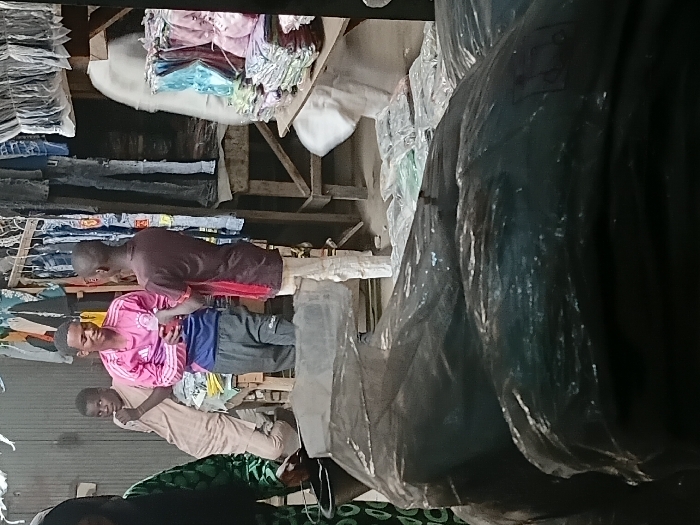 The image portrays a market scene in Fagge D1, Nigeria. In the immediate foreground, several large, dark bundles wrapped in black plastic sheeting partially obstruct the view. To the left, a partially visible individual, wearing a green patterned garment and a dark head covering, holds a black bucket. In the midground, three males are present. Centrally positioned is a male wearing a pink long-sleeved shirt with a blue collar and a white logo, paired with dark grey pants. He faces a younger male, observed from the back, dressed in a dark red and black short-sleeved shirt and light-colored trousers. The male in pink is smiling and appears to be holding a small object in his hands, interacting with the male in the red and black shirt. To their left, in the background, another male in a light beige long-sleeved tunic leans against a wooden structure, observing the interaction. The background features market stalls constructed from wood, displaying numerous clothing items. Garments, including jeans and various shirts, hang from racks. To the right, shelves are stacked with multiple folded items of clothing, each individually sealed in clear plastic packaging. The environment suggests an outdoor or semi-enclosed commercial area.
