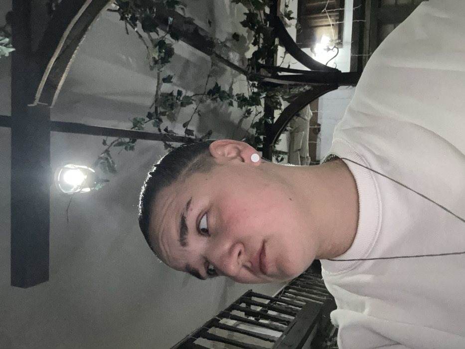 The image depicts an individual within an indoor setting in Sopot, Bulgaria. The subject is an adult with short, dark, closely-cropped hair, light skin with visible redness on the cheeks, and a neutral expression. They are looking upward and to the viewer's left. The individual wears a light-colored, long-sleeved crew-neck sweatshirt, a thin dark chain necklace, and a white circular stud earring in their right earlobe. The background reveals architectural elements consisting of dark wooden beams and arches, adorned with green leafy vines, likely artificial. A bright, exposed light fixture hangs from an overhead beam, providing direct illumination. A secondary, softer wall-mounted lamp is visible in the distant right background. A dark metal railing or balustrade is partially visible on the left side of the frame, suggesting a multi-level interior or staircase. The overall lighting is dim, highlighting the light sources and the subject's face.