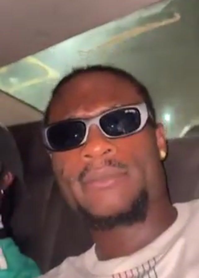 Two men are in a car, wearing sunglasses. The man in the foreground has on a white shirt with a green design on the chest. He is looking directly at the camera. He has a short beard. The man in the background is wearing a green shirt and a black hat. He has a necklace. The interior of the car is visible.