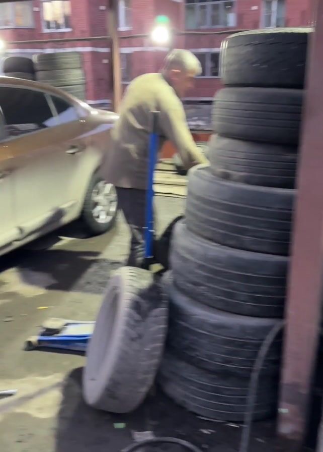 man working on a bronze or two-tone Renault Fluence in an outdoor covered area. Several stacks of used tires are visible. A blue jack and a green impact drill lie on the ground. The man, wearing a light-colored sweater, appears to be changing or working on the car's tires. The surroundings suggest an auto repair or tire shop. In the background, a brick building can be seen. The car is dirty.