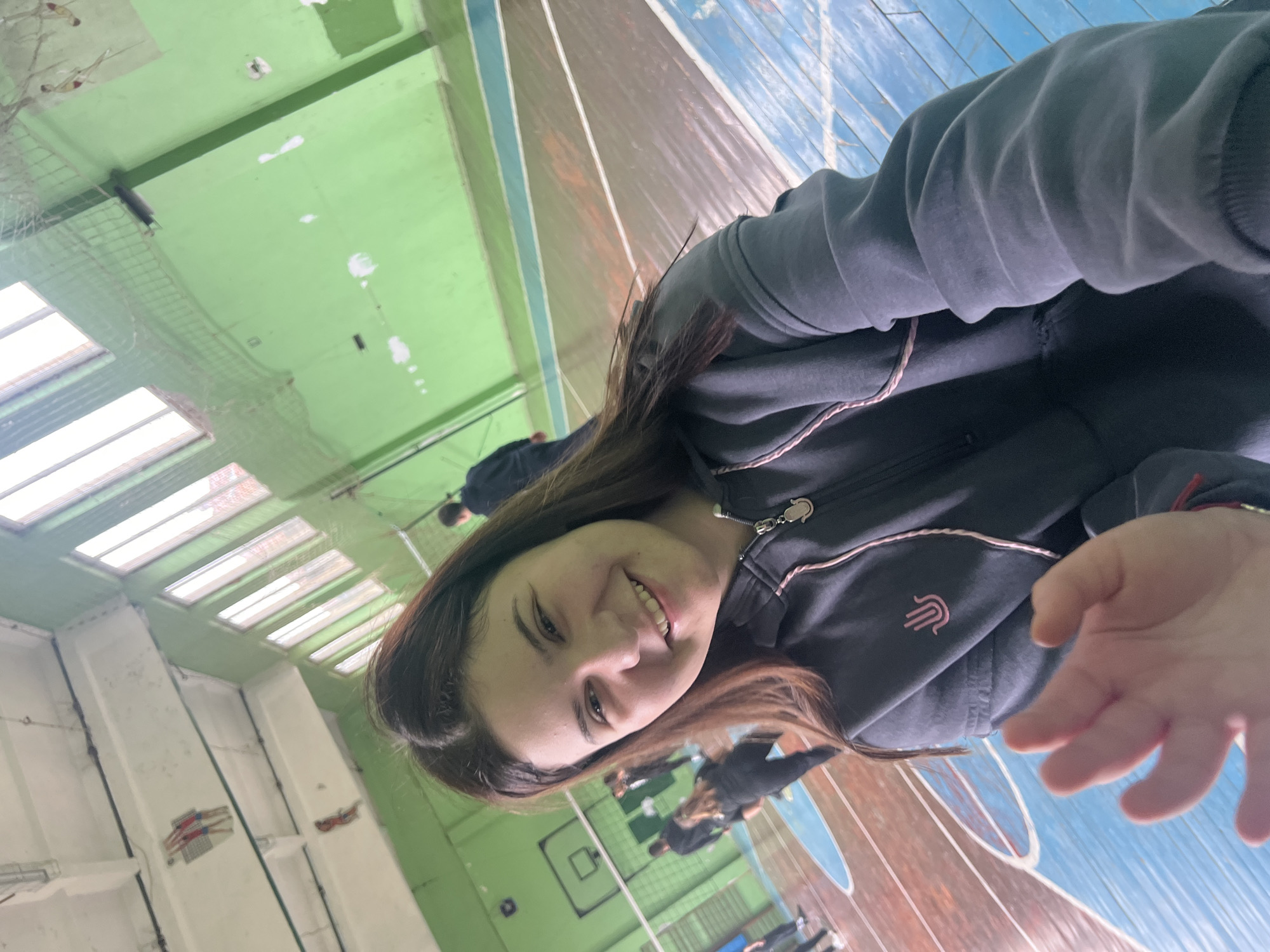 The image depicts a young female in the foreground, smiling and looking directly at the camera. She has long, dark brown hair and wears a dark grey hooded sweatshirt with a zipper, pink piping, and a pink stylized hand emblem on the left chest. A small Hamsa charm hangs from the zipper pull. Her right hand (viewer's left) is partially visible in the bottom-left corner, out of focus. The background reveals a sports gymnasium, identified as being in Cherven Bryag, Bulgaria. The walls are painted a light green, exhibiting areas of peeling paint and white patching. Tall, multi-paned windows are present on the right wall. The ceiling is white with visible structural beams. Two stylized figures, appearing to be gymnasts or acrobats in red and blue attire, are mounted high on a white beam in the upper-left background. The gym floor is a multi-sport court, featuring faded blue and brown sections with white boundary lines, indicative of a volleyball court and potentially other sports. A volleyball net is stretched across the mid-ground, and a basketball hoop backboard is partially visible to the left of the net. Several individuals, mostly wearing dark athletic clothing, are present in the mid-ground and background, standing or moving on the court. One person near the mid-left wears a blue shirt. The gym appears to be an older facility with signs of wear.