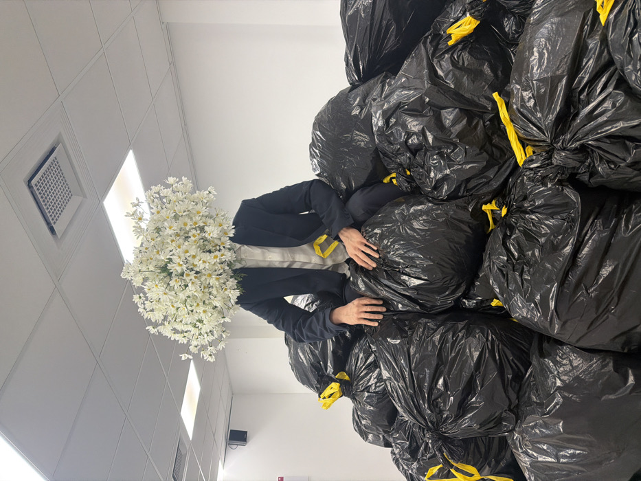 An indoor photograph depicts a single individual seated atop a large mound of black plastic garbage bags