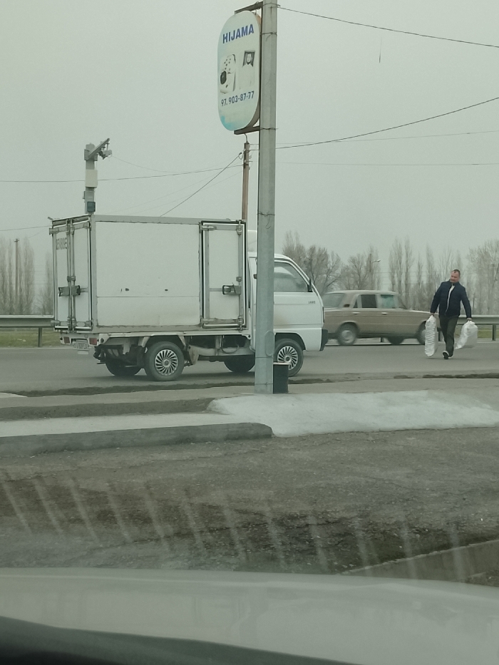 The image depicts an overcast street scene in Syrdarya, Uzbekistan. In the foreground, a white, four-wheeled mini-truck with a box-style cargo body is parked or slowly moving towards the right. The truck has two doors on its rear, small hubcaps on its wheels, and a blurred license plate, potentially "10 B...LA". An apparatus resembling a surveillance camera with an antenna is mounted on the top rear of the truck's cargo box. Adjacent to the truck, a grey utility pole stands centrally, featuring an oval-shaped sign that reads "HIJAMA" at the top, followed by two circular graphics and the phone number "97-903-87-77". To the right of the truck, a male pedestrian, dressed in a dark jacket and trousers, walks right-to-left across the frame, carrying two large, clear plastic bags in his hands, each appearing to contain several lighter, possibly translucent objects. Behind the pedestrian, a light brown or beige sedan, possibly an older model, is in motion, blurred due to its speed. The background features a line of tall, bare deciduous trees and overhead utility lines against a uniformly grey, overcast sky. The foreground includes a concrete curb, an asphalt road with visible tire tracks, and a darker, possibly damp, dirt or gravel area. The bottom section of the image shows reflections, indicating it was taken from inside a vehicle.