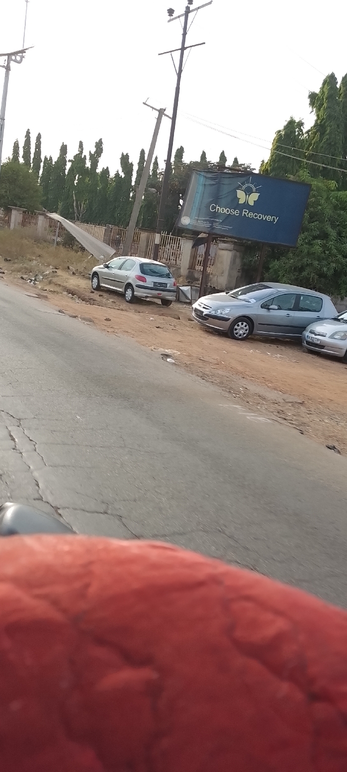 The image captures a roadside scene featuring several parked vehicles, including silver hatchbacks. A prominent "Choose Recovery" billboard stands adjacent to the cars. Utility poles stretch into the sky, and lush green trees line the background. A weathered stone wall runs parallel to the road. The foreground is dominated by an indistinct, blurry reddish-orange form. The scene appears to be captured from a moving vehicle on a sunny day.