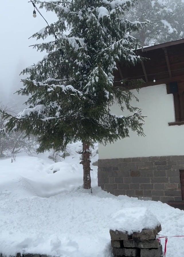 The camera pans across a snowy outdoor scene. A building with white siding and a stone foundation is visible to the right, decorated with string lights. A snow-covered pine tree stands nearby. The camera then moves to reveal a landscape covered in deep snow, with trees disappearing into a thick fog in the background. There are several picnic tables buried in snow, and a small stone wall with decorative green and white striped wooden Christmas trees in front of it. The scene evokes a sense of winter isolation and stillness.