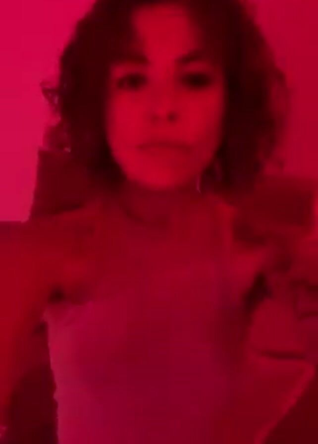 A woman with curly hair, wearing a tank top and featuring a tattoo on her right arm, is situated in a room illuminated by red light