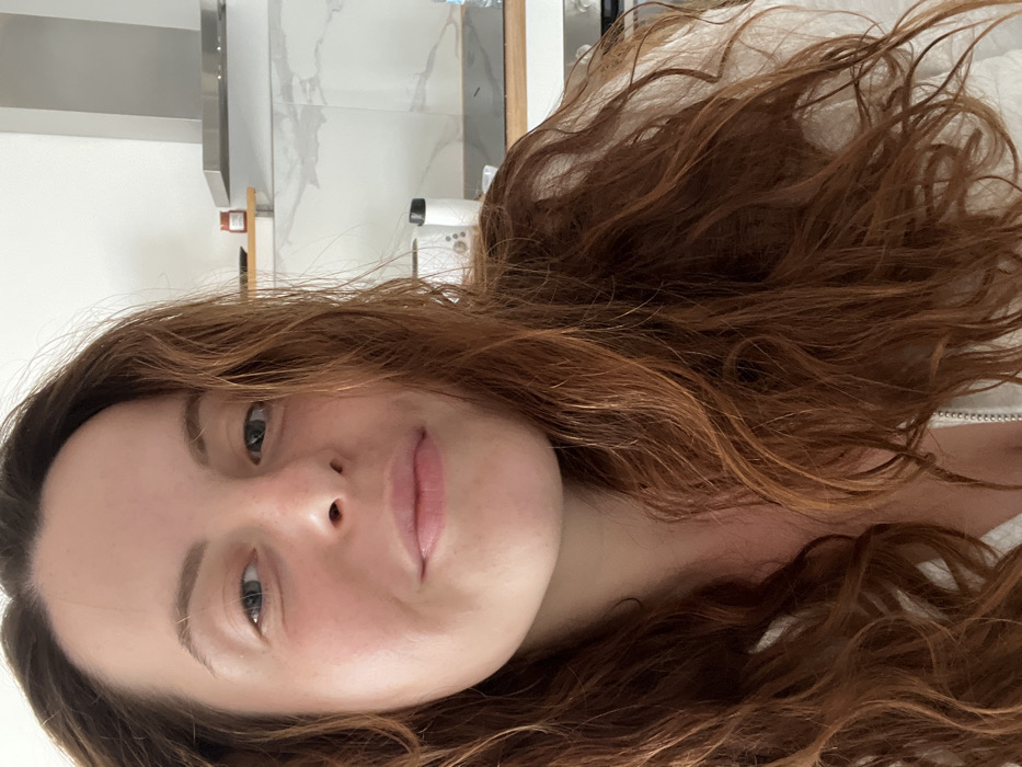 A female individual is depicted in a close-up, chest-up shot, positioned centrally within what appears to be a residential kitchen in Lloret de Mar, Spain. The subject has fair skin, wavy, auburn-colored hair cascading over her shoulders and chest, and light-colored eyes. Her lips are closed, forming a slight upward curve. Her head is angled slightly to her right, with her gaze directed towards the camera. She wears a light-colored, possibly white or light grey, zippered garment, with the zipper pull visible at the bottom center of the frame. The background shows a contemporary kitchen setting. To the subject's right, a stainless steel range hood is mounted on a white wall above a white tiled backsplash featuring grey, marble-like veining. A light-colored wooden floating shelf is visible to the left of the range hood, holding a small, reddish-orange jar or bottle and a dark, flat object. Below the backsplash, a countertop with a light wood edge is visible, upon which a white patterned cylindrical object, a white travel mug, and a clear plastic bottle are placed. A metallic surface, consistent with a stovetop or oven door, is partially visible at the bottom right.