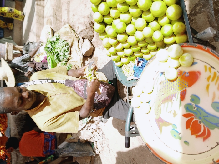 This image depicts an outdoor market scene in Gweru, Zimbabwe. In the foreground, a large, circular, cream-colored enamel tray featuring a vibrant fish and lotus flower design holds several small, round, light green fruits. To the right of this tray, a substantial pile of identical light green fruits is contained within a dark green tub or basket. A young male, possibly a vendor, is positioned centrally, kneeling or squatting. He wears a mustard-yellow collared shirt and dark trousers, with a dark, patterned shoulder bag bearing "KUCHEN" text across his chest. He is actively engaged in peeling one of the light green fruits with a small, curved knife held in his right hand. Discarded peelings are visible in a small green bowl beside him. In the background, two other individuals are present. To the left, a person in an orange shirt and a patterned skirt is seated facing away from the viewer. To the right, another person wearing a straw hat and a striped garment is partially visible, seated behind a mound of leafy green vegetables displayed on a light-colored sack or mat. The ground surface appears to be dry, light-colored earth. The scene is brightly illuminated by direct sunlight.