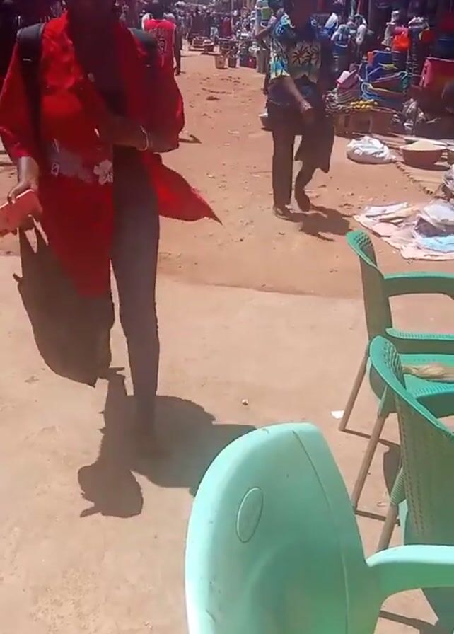 street scene in a busy market. The road is unpaved and dusty. There are many people walking, some of whom are carrying bags or goods. There is a man pushing a wheelbarrow. On the right side of the frame are several empty green plastic chairs. There are various stalls and shops lining both sides of the street selling a variety of goods. The overall scene is active and appears to be taking place during the day.