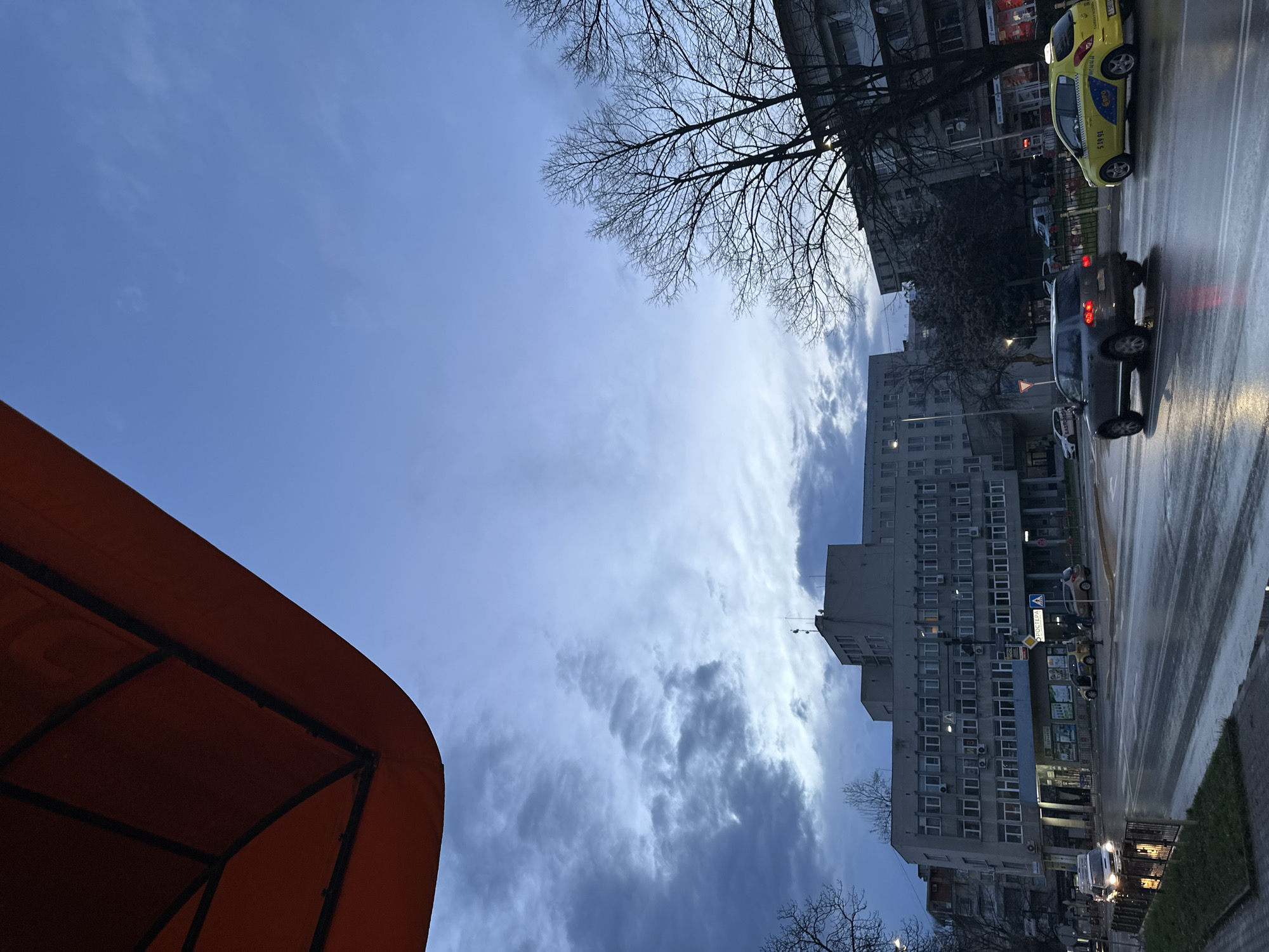 street scene in Targovishte, Bulgaria on a cloudy day. A multi-story building stands to the right, with numerous windows visible. Below are the words "O POKHTEPA" written in Cyrillic, suggesting this is a post office. Trees with bare branches are present. The street is wet, indicating recent rain. Cars, including a yellow taxi cab with the license plate "TX 616 TS" are on the street. An orange awning is visible in the left foreground. The sky is cloudy, obscuring the buildings in the distance.