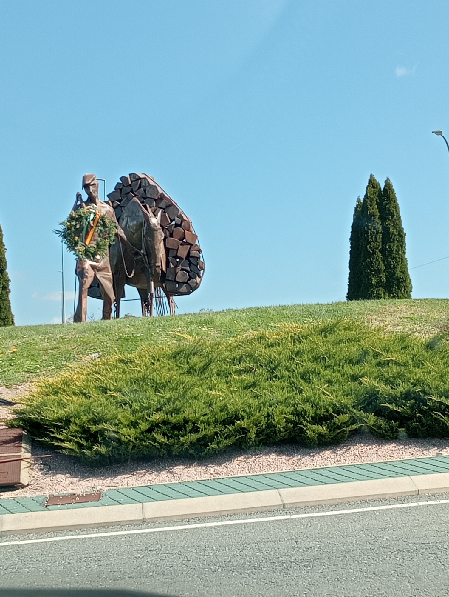 The image displays a monument situated on a landscaped island within a roundabout in El Espinar, Spain, under a clear, light blue sky. The central feature is a bronze-toned metal sculpture depicting a male figure, dressed in a hat and tunic, holding reins while standing beside a pack animal, identified as a donkey or mule. The animal carries a large, stylized load composed of angular metal pieces resembling stacked logs. A green wreath adorned with red and yellow ribbons is draped around the human figure's neck. The sculpture rests on a gently sloped, grass-covered mound. Tall, slender evergreen trees are situated around the mound; one is partially visible on the far left, and a prominent cluster of three stands on the far right. A dark street light fixture is partially visible in the upper right of the frame. In the immediate foreground, a grey asphalt road surface with a white painted line is present. This is bordered sequentially by a concrete curb, a section of paving with diagonal green and grey stripes, and a narrow strip of light-colored gravel. These elements precede a dense, low hedge of green shrubs forming the base of the grassy island. No active human presence or interaction is observed in the scene.