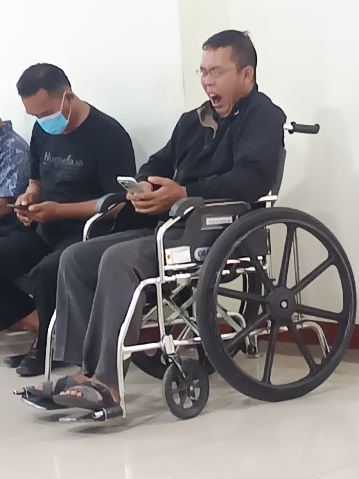 In an indoor setting within Karangtengah, Indonesia, two men are seated against a plain white wall with a light-colored floor. The man in the foreground on the right is seated in a manual wheelchair with a silver frame, black upholstery, and black spoked wheels. He wears dark-rimmed glasses, a dark long-sleeved top over a lighter collar, and dark grey trousers with dark flip-flops on the footrests. He holds a silver smartphone in both hands and is captured mid-yawn, with his mouth wide open. To his left, partially obscured, a second man wears a black t-shirt with light lettering, a light blue disposable face mask, and dark trousers. He is looking down at a dark smartphone held in his hands. A third individual is partially visible on the far left, wearing a patterned shirt.