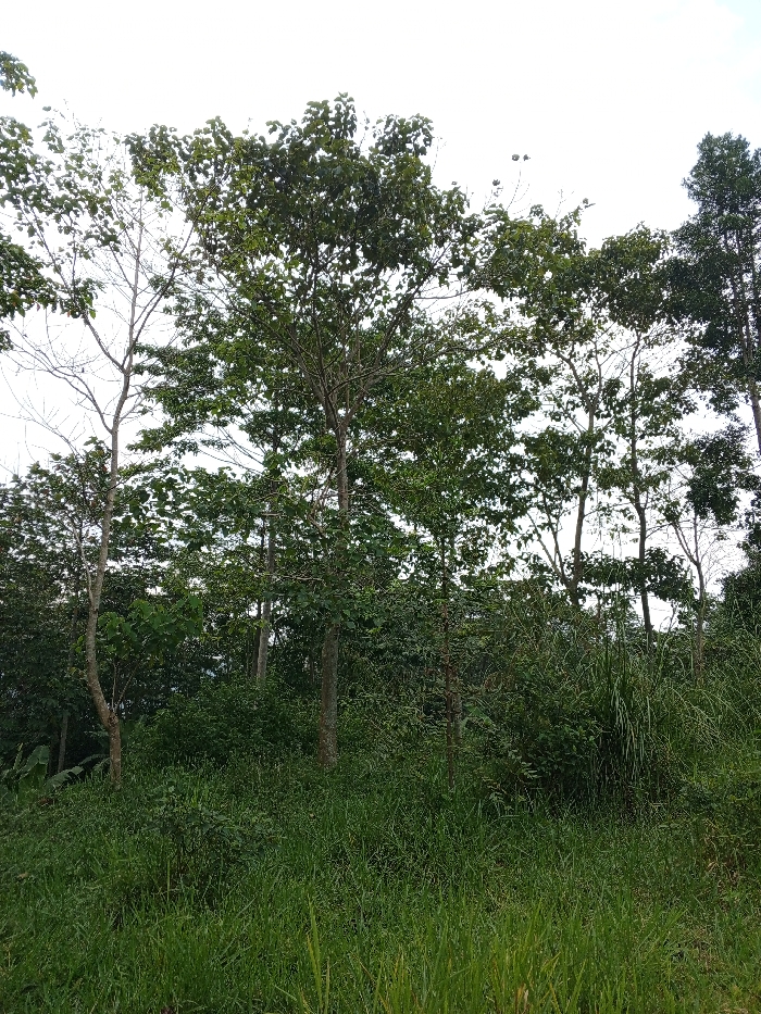 The image displays an unpopulated outdoor natural environment located in Thotagamuwa, Sri Lanka. The scene is dominated by dense green vegetation under an overcast or brightly diffused sky. The foreground consists of tall, verdant grass and low-lying bushy undergrowth. Extending into the midground and background, numerous trees are visible; some possess full canopies of broad green leaves, while others exhibit sparser foliage or bare branches. No individuals, animals, man-made objects, or human activities are present. The overall lighting is diffuse, suggesting a daytime setting without direct sunlight.